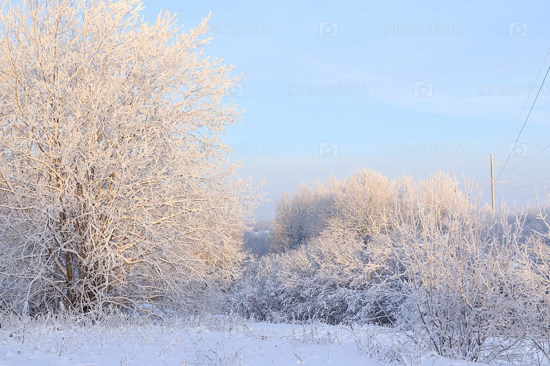 Русская природа зимой, новогодний фон. После снегопада ветки деревьев покрываются снегом и сверкают на солнце, в сильный мороз и низкие температуры. Это красивый зимний баннер, новогодняя открытка,