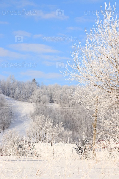 После снегопада ветки деревьев покрываются снегом и сверкают на солнце, в сильный мороз и низкие температуры. Русская природа зимой, Рождественский фон. Это красивое зимнее знамя, новогодняя открытка,