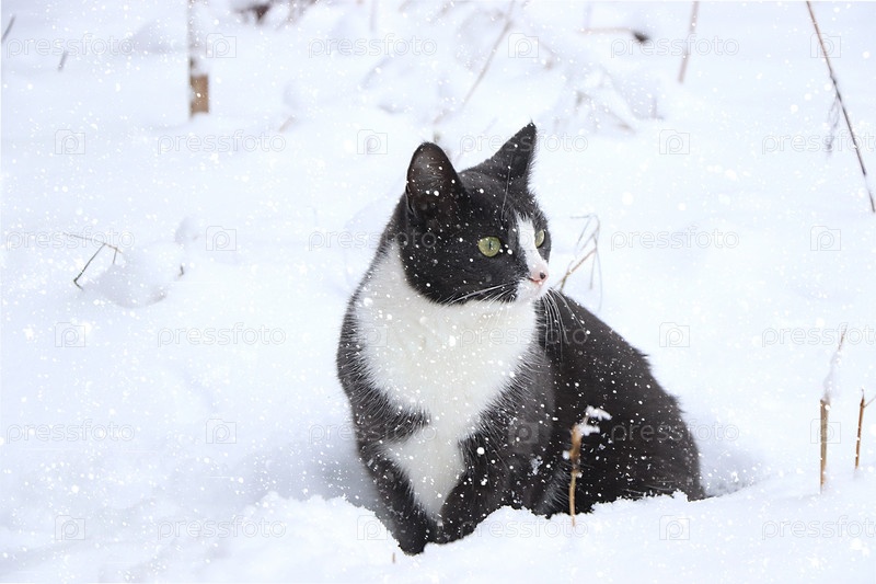 Забавный домашний кот в сугробе играет со снегом. Домашнее животное впервые увидело снег и развлекается, зимний фон, рождественская открытка, выборочный фокус