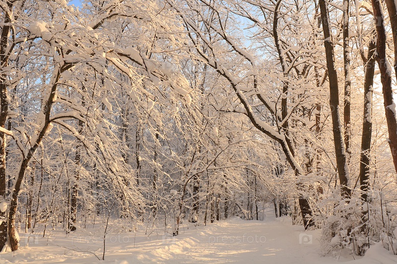 Русская природа зимой, новогодний фон. После снегопада ветки деревьев покрываются снегом и сверкают на солнце, в сильный мороз и низкие температуры. Это красивый зимний баннер, новогодняя открытка,