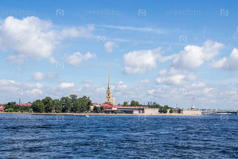Россия, Санкт-Петербург, 3 июля 2020, Петропавловская крепость.. На фото Петропавловская крепость на Неве и катер с туристами, вид со стрелки Васильевского острова