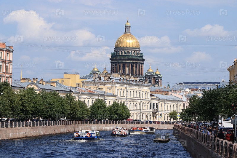 Россия, Санкт-Петербург, 1 июля 2019 г. Исаакиевский собор. Вид с Поселуева моста. На фото купол Исаакиевского собора в окружении жилых домов на берегу реки Мойки