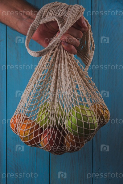 Мужчина держит хлопковую сетку с органическими фруктами на деревенском синем фоне. Экологически чистая концепция безотходного производства