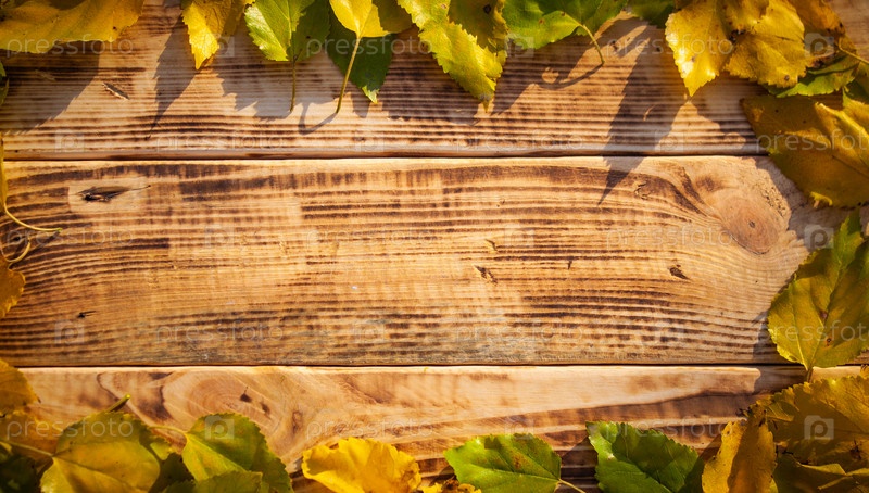 Осенние листья на фоне сгоревших деревянных. Текстура желтых и красных листьев на коричневом дереве вид сверху с копировальным пространством