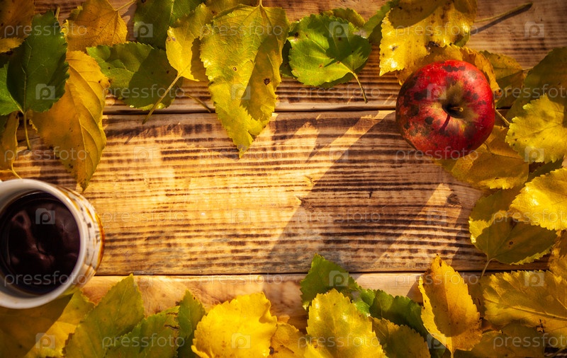 Желтые и зеленые листья на фоне сгоревшей доски с чашкой чая и яблоком. Место для текста