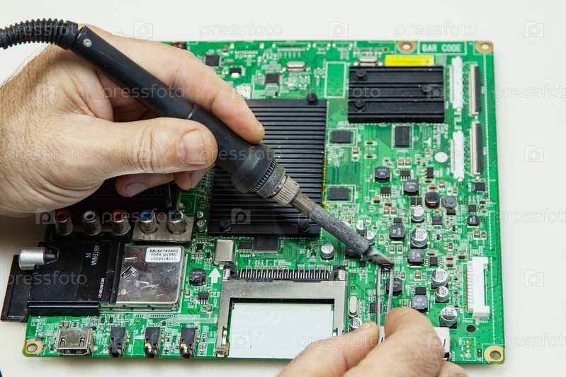 Мужские руки с паяльником ремонтируют материнскую плату телевизора