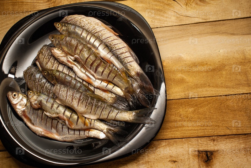 Плоский лежал небольшой свежий рыбный голавль на черной тарелке на деревянной коробке