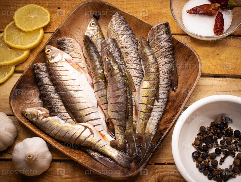 Плоский кусок свежей рыбы на деревянной квадратной коричневой тарелке на деревянном фоне, украшенный лимоном, специями, сушеным перцем, солью и чесноком