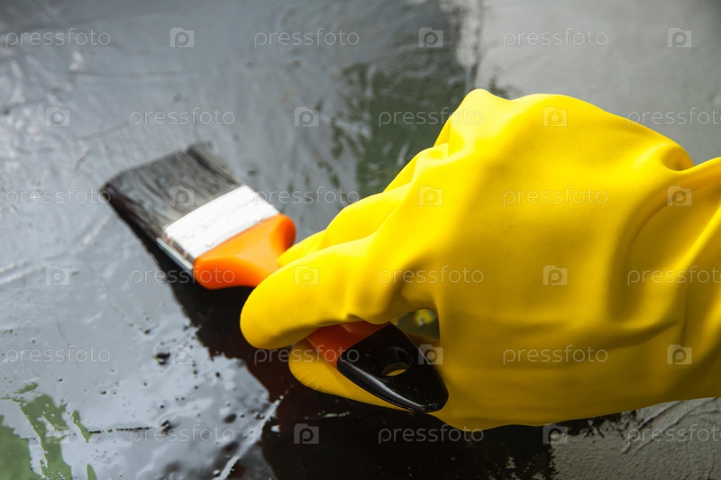 Крупный план руки в желтой резиновой перчатке кистью, окрашивающей бетонную поверхность черной краской