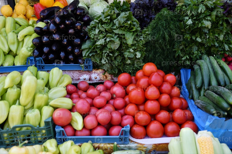 Свежие овощи и зелень продаются на базаре