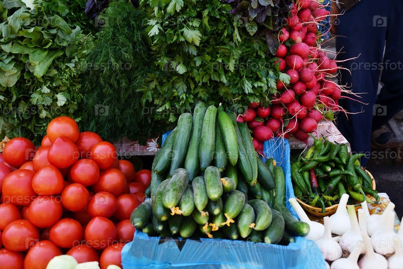 Свежие овощи и зелень продаются на базаре