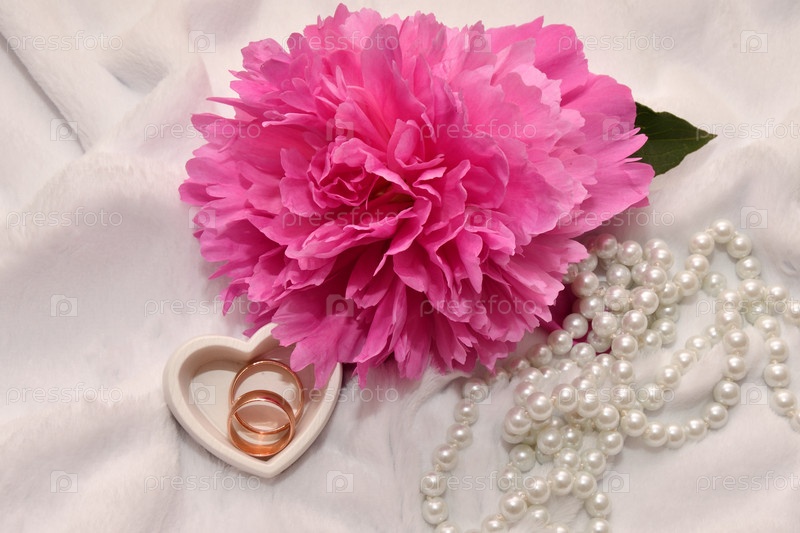 Два обручальных кольца и цветок пиона