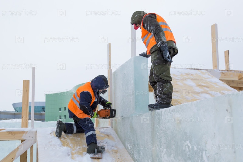Монтажники на строительстве ледового городка