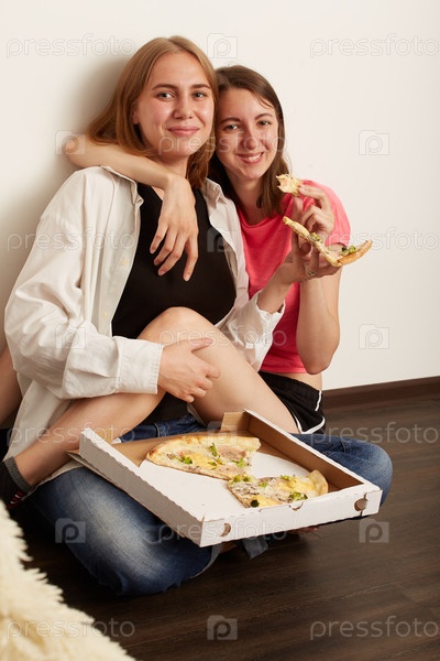 Девушки едят пиццу