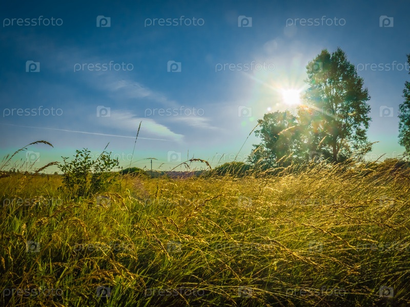Солнце освещает сохнущую траву с колосьями на июльском поле