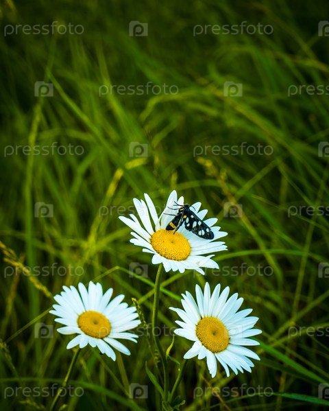Бабочка с черными крыльями сидит на одичалой белой ромашке