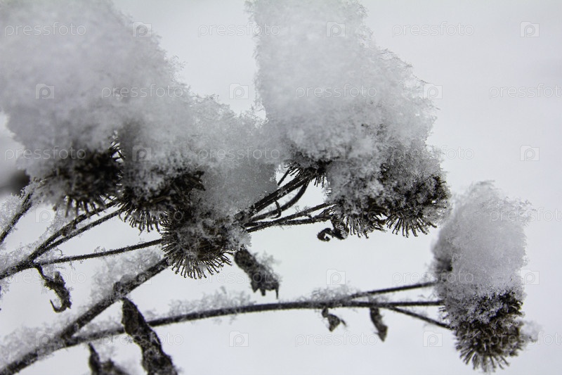 Сухие колючие семена лопуха на сухих стеблях, покрытых шапками свежевыпавшего снега