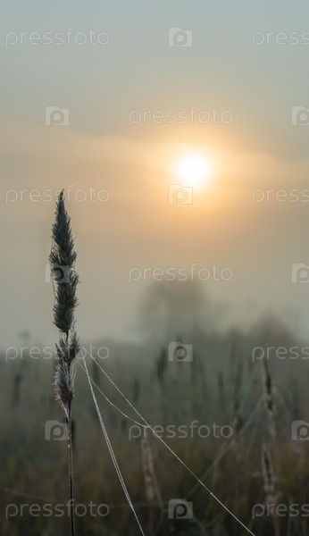 Стебель с колосом сухой полевой травы с паутиной и покрытый каплями росы в осеннем туманном поле