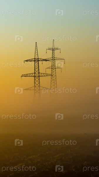 Туманное утро в осеннем поле с линией электропередач и проселочной дорогой