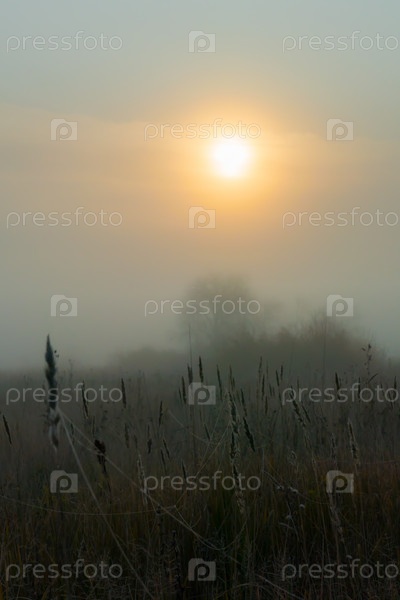 Стебель с колосом сухой полевой травы с паутиной и покрытый каплями росы в осеннем туманном поле