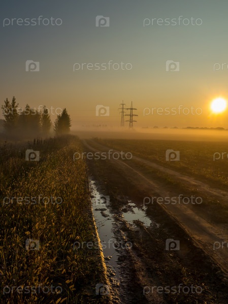 Туманное утро на вспаханном поле с линиями электропередач и проселочной дороге с трассой, заполненной дождевой водой