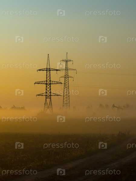 Туманное утро в осеннем поле с линией электропередач и проселочной дорогой