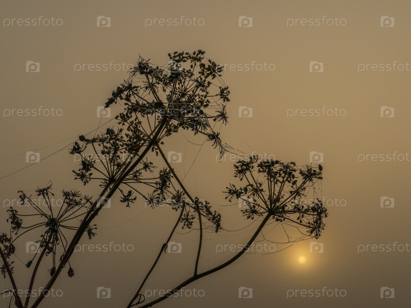 Силуэты сухих стеблей борщевика на фоне восходящего солнца