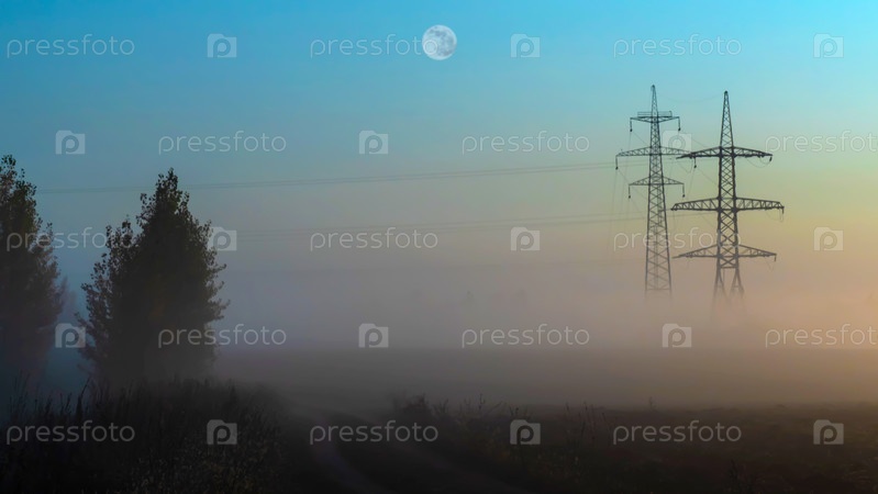 Полная луна в осеннем поле над линией электропередач