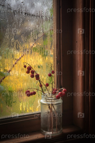 Осенний натюрморт с плодами ландыша у запотевшего окна