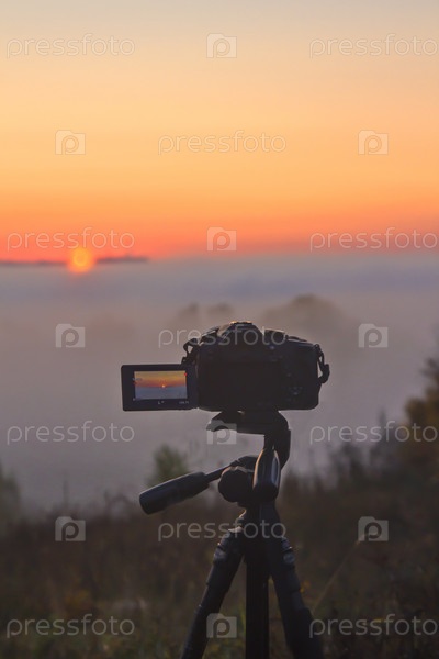 Камера снимает временные интервалы восхода солнца туманным утром
