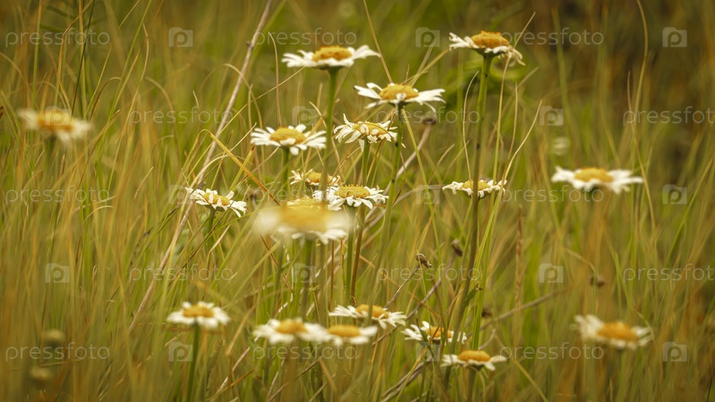 Полевые маргаритки вянут под жарким солнцем в засушливое лето