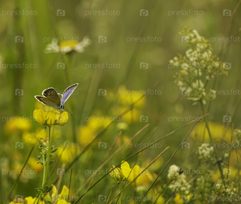 Бабочка и желтые цветы в летнем поле под теплыми лучами солнца