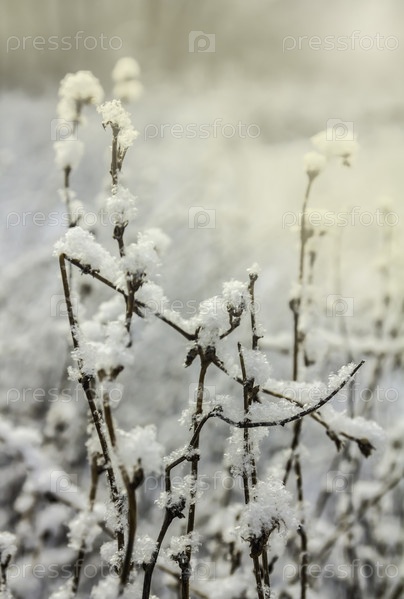 Заснеженные ветки цикория на опушке леса в начале зимы