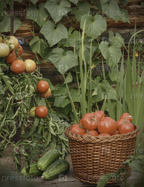 Урожай помидоров и огурцов в загородном саду