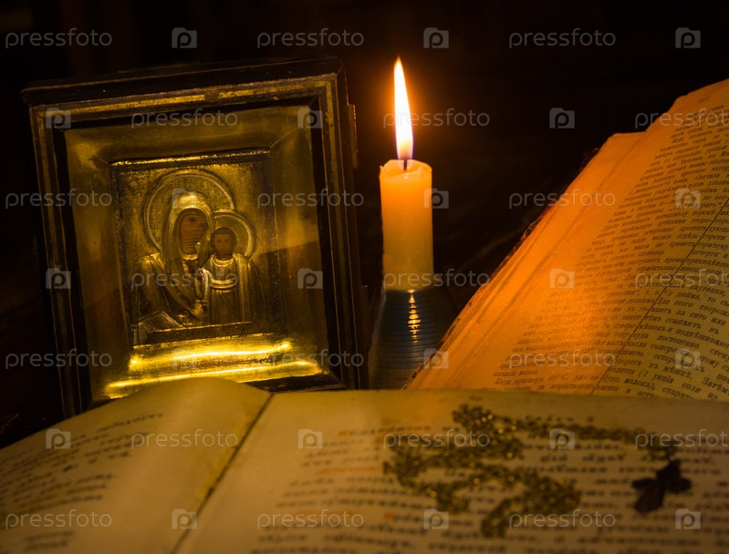 Свеча освещает икону Богородицы