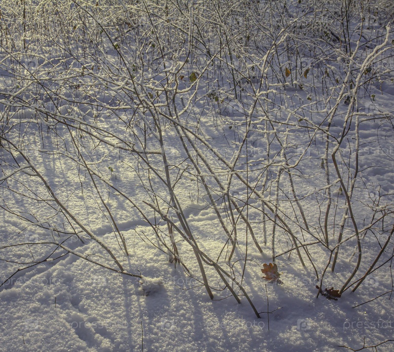 Следы на свежевыпавшем снегу в кустах с редкими опавшими листьями в начале зимы