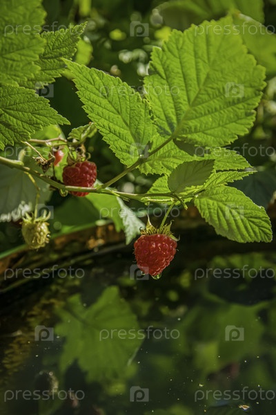 Ветви садовой малины с ягодами над бочкой с дождевой водой