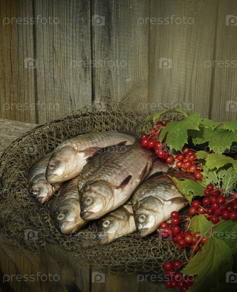 Пойманный карась на рыболовную сеть и ягоды калины на ветках возле деревянной стены