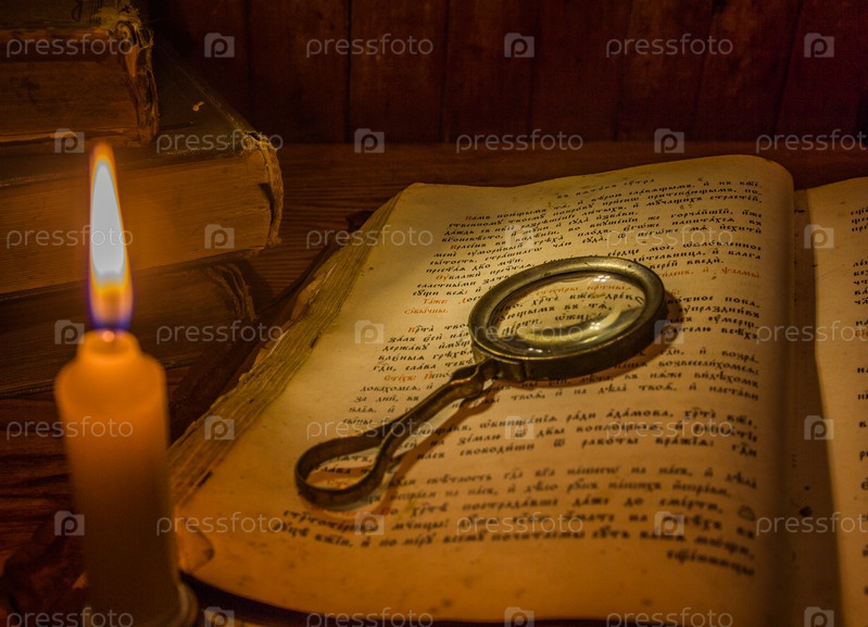 Открытый древний молитвенник и увеличительное стекло на его открытых страницах под светом свечи