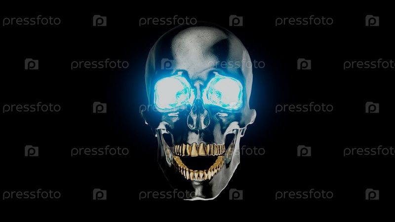 Стальной человеческий череп с ярко-синими светящимися глазами 3D рендеринг