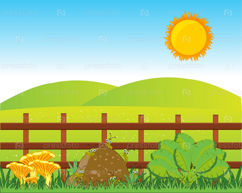 Красочный летний пейзаж с забором и растениями