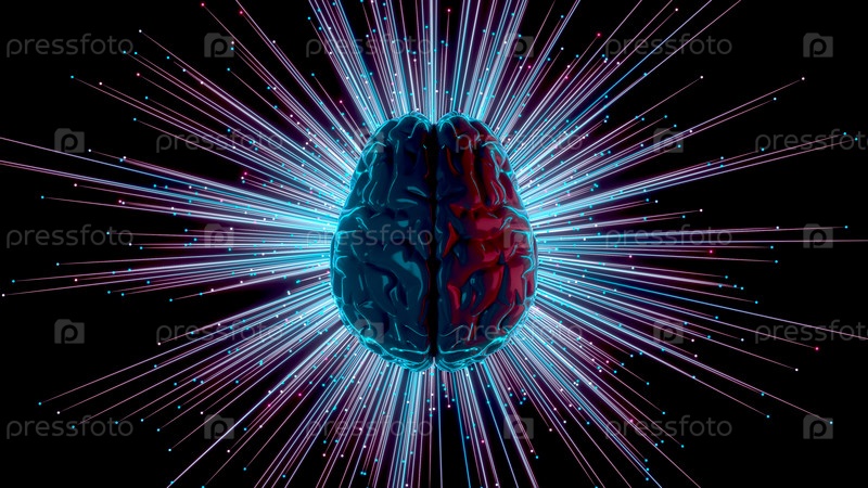 Абстрактная визуализация активности человеческого мозга с отпечатками и частицами 3D-рендеринга