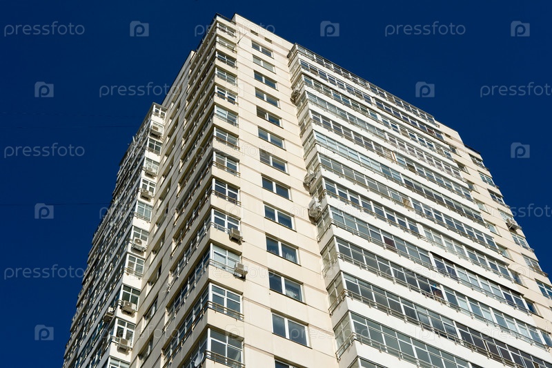 Новый многоэтажный дом на синем фоне, вид снизу