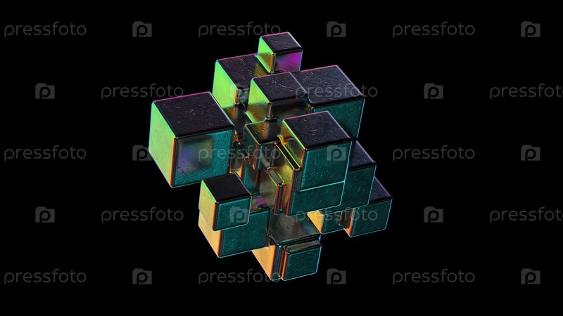 Абстрактный металлический куб с радужными отражениями 3D-рендеринга