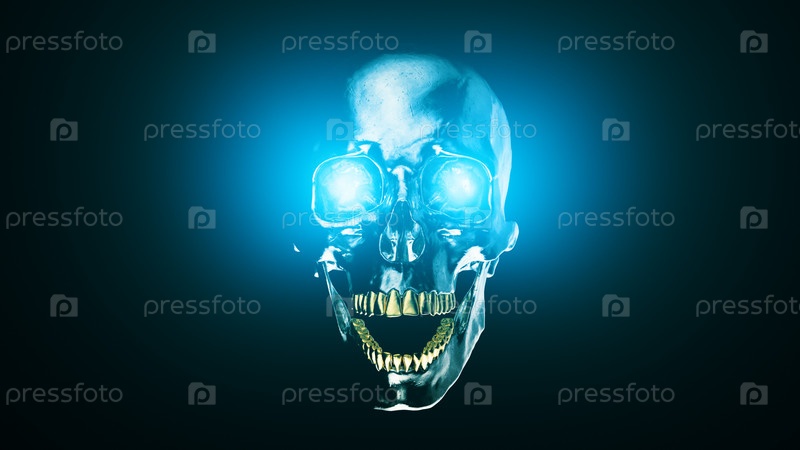 Человеческий череп из стали с синими светящимися глазами 3D-рендеринг
