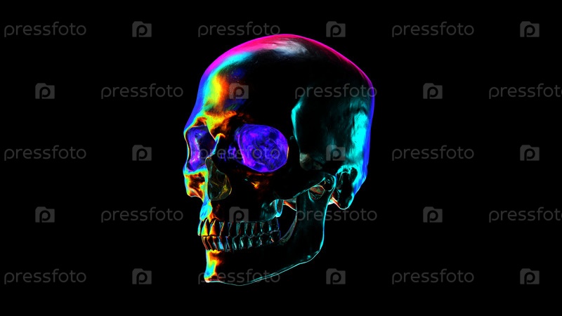 Металлический человеческий череп с красочными отражениями 3D-рендеринга