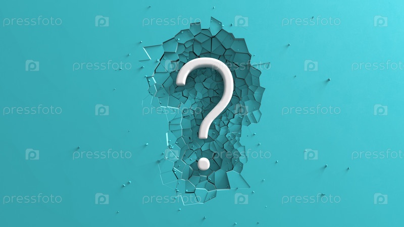 Большой белый вопросительный знак на фоне бирюзового цвета с эффектом удара, разрушающим пол 3D-рендеринга