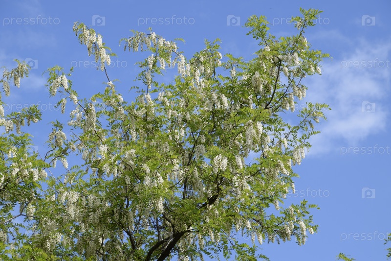 Цветение белых гроздей акации, робиния цветет