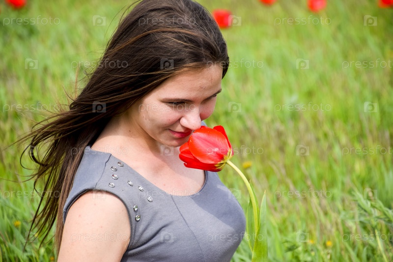 Красивая девушка в поле среди цветов тюльпана