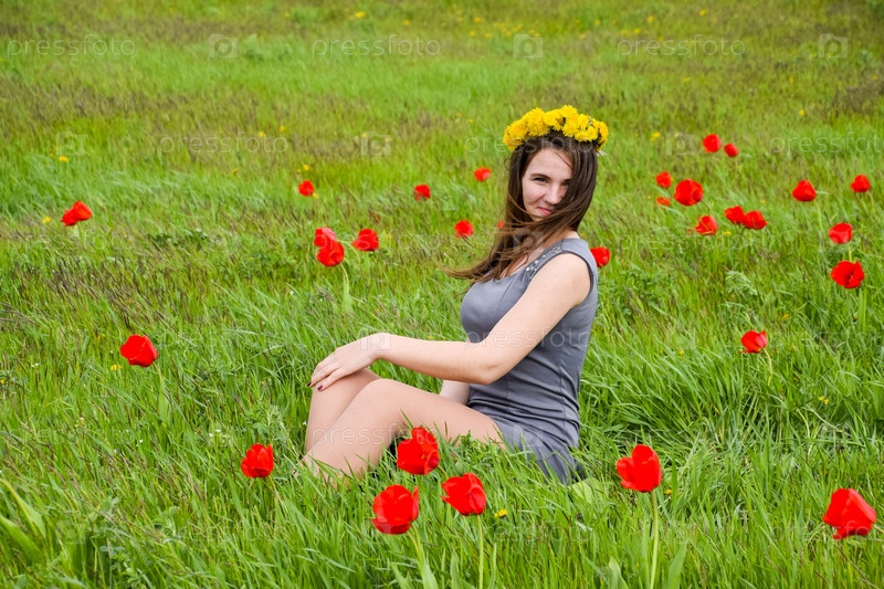 Красивая фея маленькая девочка в поле среди цветов тюльпана